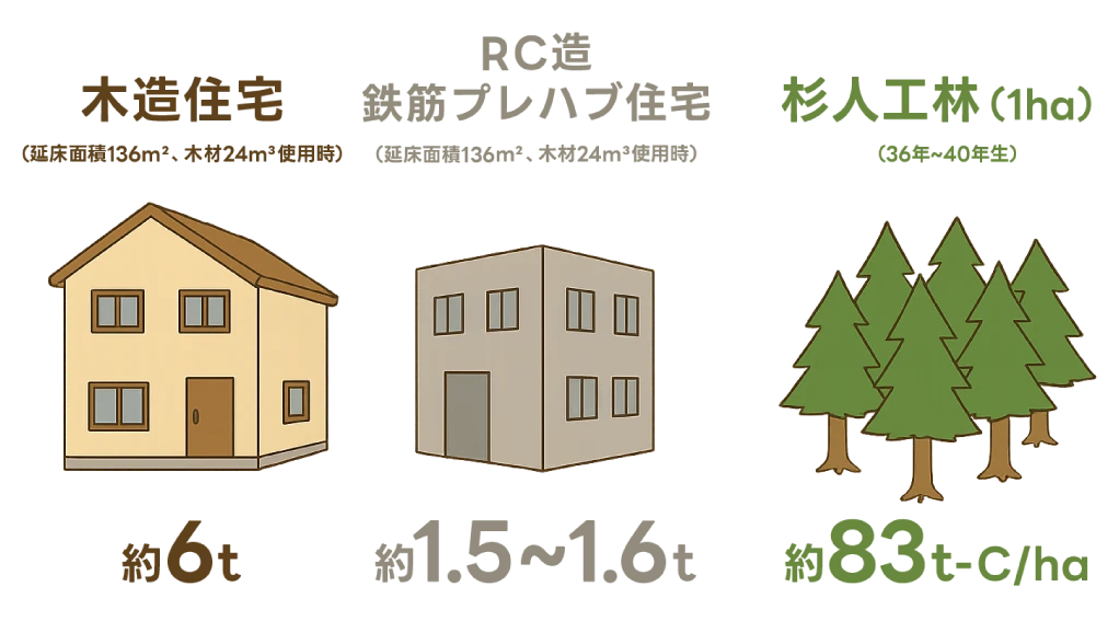 乾燥した木材は炭素を約 250 kg /m3 貯蔵しており、延床面積 136m2 の木造住宅では、木材を約 24 m³使用しており、蓄えている炭素量は 6t にも及びます。一方、RC 造のマンションや鉄筋プレハブ住宅では 1.6t と1.5t となり、木造の 4 分の 1 になってしまいます。日本の全住宅に使われている木材が貯蓄している炭素量は 1.41 億 t で、このうち木造住宅が 1.29 億 t に及ぶと言われています。これは蓄積されている炭素量に換算すると、日本の全森林の約 20%、人工林の 50%弱に相当します。※1