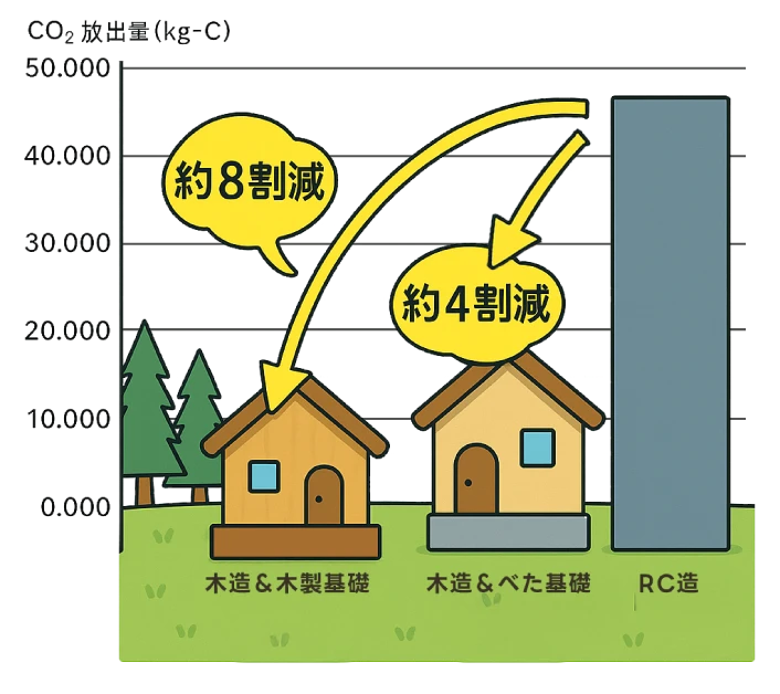 基礎を木造化した場合、同じ木造上屋の建築物において、従来のコンクリート基礎(べた基礎)から木製に変更することで、約 4 割の CO2 放出量(kg-C)の削減が見込まれると試算されています。この試算は、建築行為(材料製造・輸送・建築・解体)における CO2放出量の中で、最も高い割合(約 9 割)を占める材料(製品)製造時の放出量に着目して行われました。なお、この試算では木材中に固定される炭素量の評価は除外されています。