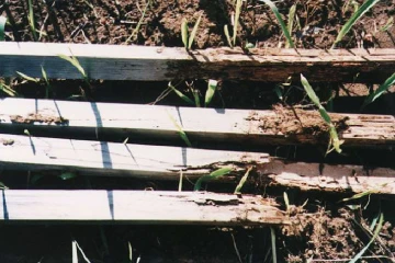 筑波森林総合研究所での実験では、無処理材は 1 年目から劣化が始まる中、処理材は 30 年間土に埋め続けた木杭でも劣化が見られませんでした。